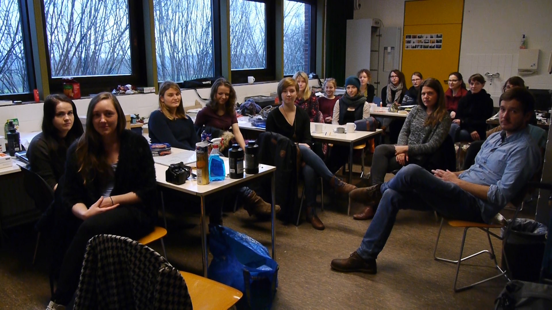 Praca ukazuje grupę studentów siedzącą w pracowni fotograficznej i patrzącą w jeden punkt – wprost w obiektyw kamery, a w efekcie na widza. Szesnaście osób jest w niego wpatrzonych. Osoby te delikatnie się poruszają. Za oknem widać poruszane wiatrem drzewa. Statyczna, pomimo drobnych ruchów, sytuacja trwa w nieskończoność. Kontakt wzrokowy jest permanentny. Brak wyraźnych zdarzeń powoduje, że widz ogląda tę pracę, jakby była obrazem malarskim, czy grupową fotografią. Przygląda się pojedynczym postaciom; zaczyna doszukiwać się znaczenia w drobnej mimice czy gestach. Oglądając, zostaje wciągnięty w sytuację wymiany spojrzeń. Ostatecznie jednak to on musi podjąć decyzję o przerwaniu kontaktu wzrokowego.