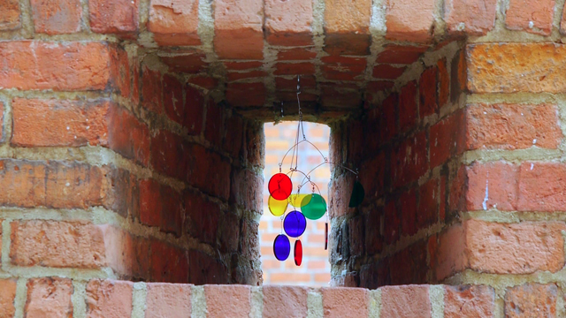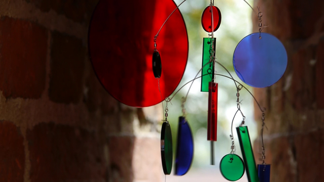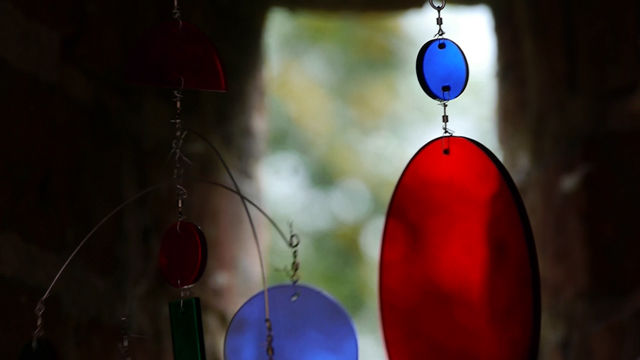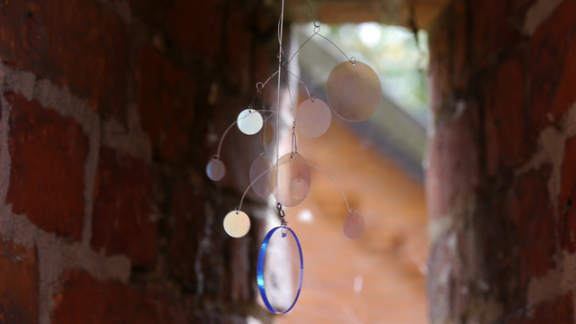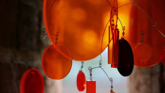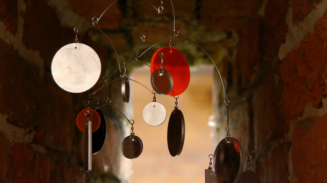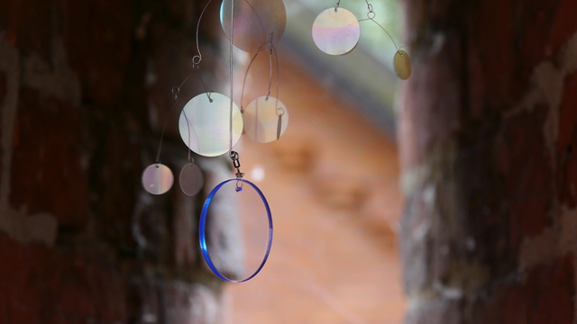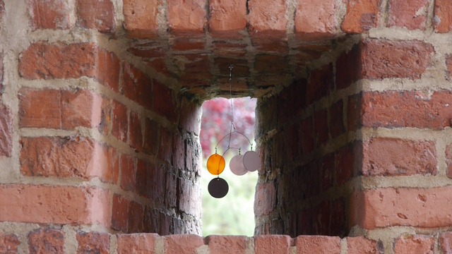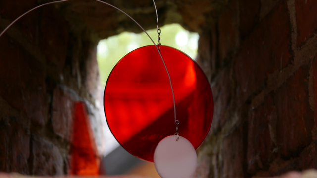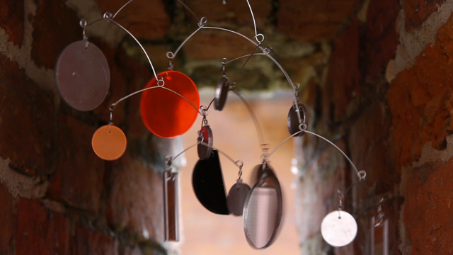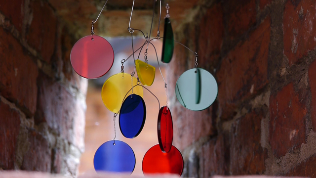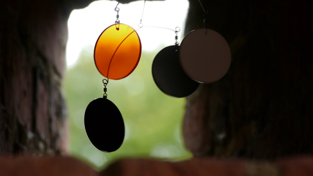 A set of sculptural mobiles (8pcs, height approx. 20-30cm) placed in ambassadors. Depending on the material used, they transmit or reflect light. They form a rectangular moving image, and the action of looking is in effect reminiscent of looking inside a mechanism, examining how it works inside, or observing the world through a camera viewfinder. Some of the installations were created during workshops with the city's inhabitants.